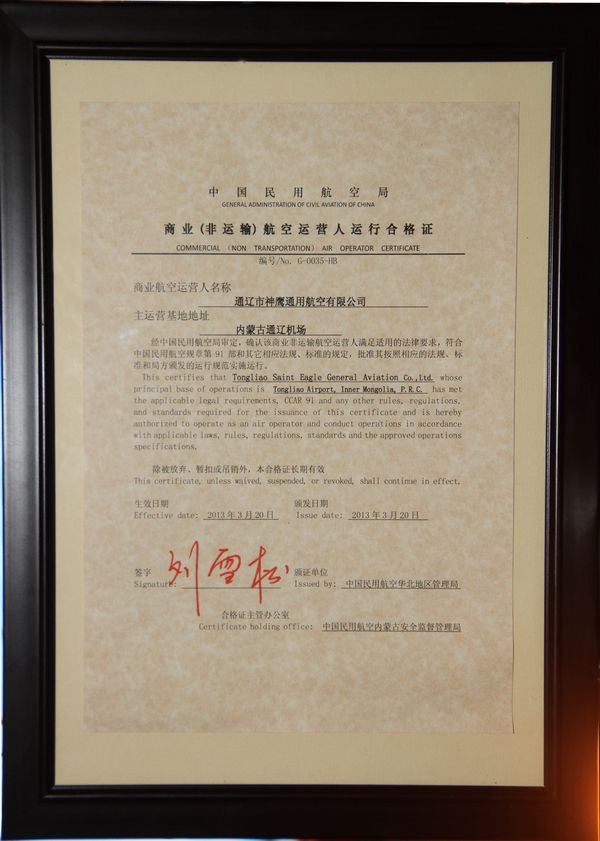 2013年3月28日,通遼神鷹通用航空有限公司CCAR-91部運(yùn)行合格審定頒證儀式在神鷹通航召開。神鷹通航孫學(xué)慧副總經(jīng)理主持了本次會(huì)議,內(nèi)蒙古監(jiān)管局副局長(zhǎng)李陸康向通遼神鷹通用航空公司頒發(fā)了《商業(yè)非運(yùn)輸航空運(yùn)營(yíng)人運(yùn)行合格證》, 內(nèi)蒙古機(jī)場(chǎng)集團(tuán)公司通遼分公司領(lǐng)導(dǎo)參加了頒獎(jiǎng)儀式。這是內(nèi)蒙古地區(qū)第三家獲得CCAR-91部運(yùn)行許可的通用航空公司,也彌補(bǔ)了內(nèi)蒙古中東部地區(qū)通航事業(yè)的空白。